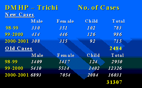 Heath Care Delivery of Trichi District: Government and Non-Governmental agencies provide health care needs of Trichirapalli. District Government Hospital, Taluk Hospitals, panchayats Dispensaries and Primary Health Centres are the government agencies involved in the health care delivery system. There is one District Head Quarters Hospital, 6 Taluk hospitals, 4 dispensaries, 1 Tamilnadu special police hospital and 50 Primary Health centres including 2 upgraded primary health centres. Govt Annal Gandhi Memorial Hospital, which has recently been affiliated to K.A.P.V Medical College, at Trichirapalli, has 603 beds with 12 speciality departments including Psychiatry. 76 Asst surgeons including one psychiatrist, 107 nurses, one extension educator and one social worker are posted to the Headquarters hospital. Total number of bed strength of six Taluk hospitals is 378. In addition Trichirapalli district has central Govt. hospitals like Railway hospital, Ordinance factory hospital, and BHEL hospital, which also cater the health needs of the industrial population. Private practitioners of medicine including Psychiatrists and private hospitals are the non-governmental agencies involved in the health care delivery system of Trichirapalli.?? Since the mental health care at primary care level needs the involvement of administrators at different level, a broad based team for the implementation of DMHP was formed. The DMHP has three components namely training of medical, para medical and community leaders, Mental Health Care delivery and Information, Education and Communication activities (IEC activities). Implementation of the program will be done jointly by Director of Medical Services and Institute of Mental Health. Services of the Director of Public Health and Director of Primary Health Centres will be utilised. Mental Health Care Delivery: The Mental Health Care Delivery under the DMHP has been planned taking into consideration the Governmental and Non Governmental agencies into account. Govt. Annal Gandhi Memorial Hospital, Trichirapalli will be the head office and administrative centre for the district mental health program. Psychiatrist attached to this hospital will be called DMHP psychiatrist and the psychiatrist recruited for the District Mental Health Team will be DMHT Psychiatrist. The Joint Director, Medical Services will be in charge of the whole program at district level and all the communications. The DMHP psychiatrist with the help of DMHT psychiatrist will carry out liaison activities. In addition to his routine duties the DMHP psychiatrist will guide the district mental health team, attend the inpatients and conduct review meetings to monitor the program. Whenever possible he will also take part in IEC activities of the district mental health program. District Mental Health Team is a multidisciplinary team exclusively recruited for Mental Health Care Delivery of the DMHP. It consists of one psychiatrist, one clinical psychologist, one psychiatric social worker, 4 nurses, and one male nursing attendant and a driver. The Psychiatrist recruited for the district mental health Team will be called as DMHT psychiatrist and he will lead the Mental Health Team under the guidance of DMHP psychiatrist.? For the purpose of mental health care the district is divided into six units belonging to six Taluks of the district. Six to eight primary health centres has been allotted to each Taluk. The existing psychiatric ward at the Annal Gandhi Hospital Trichi has been strengthened with additional 10 beds and equipment with the funds from DMHP. The DMHP psychiatrist will be in charge of the psychiatric ward. Cases requiring admission in the ward may be referred by DMHT psychiatrist from Taluk and villages to the psychiatric Out Patient room at Annal Gandhi Hospital, Trichi. District mental health team with one psychiatrist, one nurse, one psychiatric social worker, and one male nursing attendant will visit satellite Psychiatric clinics at one Taluk hospital a day for six days a week. Medical officers and paramedical staff of Taluk hospitals will collect cases to be shown to the DMHT on prescribed days. Other than these cases, PHC medical officers and health workers of the respective Taluk will bring the cases to be treated by mental health team. The follow-up of cases treated at The Satellite Clinic will be done at the primary care level. Whenever necessary mental health team will also make visits to villages to deliver mental health care subject to feasibility of the visit. In addition to mental health care the team will also engage in IEC activities with the help of the local health workers and community leaders. ??????????? Following is schedule of Taluk level satellite Psychiatric Clinics: Monday:??????????????????? Srirangam??????????????????????? 10 am to 1 pm The satellite mental health clinics were started during the month of June 1998. From June 1998 to March 1999, 783 new cases and 2950 old cases were treated at satellite mental health clinics. And during the current year 986 new cases and 12326 old cases were treated at satellite mental health clinics. Totally 13312 patients were treated.?? Following table gives the number of patients treated at satellite mental health clinics from April 1999 to March 2000.