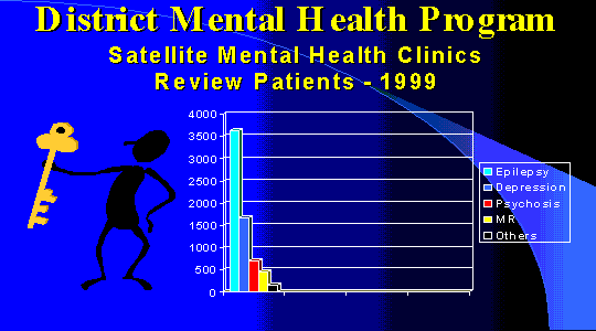 The mental health delivery system is streamlined and more number of patients are attending the satellite clinics. Most of the referrals to the satellite clinics are from old patients of satellite clinics, which show the quality and popularity of the satellite clinics. Psychiatric medicines are issued to the patients for 14 days, which eliminates the frequent visits to the clinic and reduces the expenditure involved in travelling. The network for mental health care has been established at the Taluk level and the next logical step in mental health care under DMHP will be to extend the service to Primary Health Centres. As far as training is concerned fairly good number of medical and para medical personnel had been trained in basic mental health care. 290-village health nurses and????? out 170 health inspectors and 59 of medical officers had been trained. With this the training component of DMHP comes to an end. Henceforth services of trained personnel should be utilized to extend the service to PHC and Sub centre level. Short refresher courses should be planned to maintain the mental health skills of the trained personnel. DMHP has done extremely well in the sphere of IEC activities. Especially the mental health festivals had been a grand success in creating awareness about mental health. The mental health festivals were conducted from May to July. Success of the programs is reflected in the sudden increase in the new cases attending the satellite clinics during these months. Number of printed materials was prepared for awareness activities. School awareness meeting were inspiring and encouraging. With these achievements, it is time to intensify the IEC activities and extend the mental health services to the Primary Health Centre level. During the coming years following activities will be undertaken: 1. Continuing and Strengthening the Taluk level Satellite Mental Health Clinics |