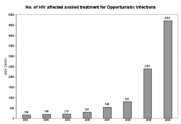 In order to have better service delivery system and to have institutional strengthening in private and public sector, training activities has been given due importance by making adequate provision in Action Plan to? impart training on HIV/AIDS to Medical, Para-medical and personnel of different sectors and departments.? This will positively bring capacity? building among a various stake holders for a better performance in AIDS Control efforts and also to face challenges in future.? About 4,110 individuals were trained on different aspects of HIV.